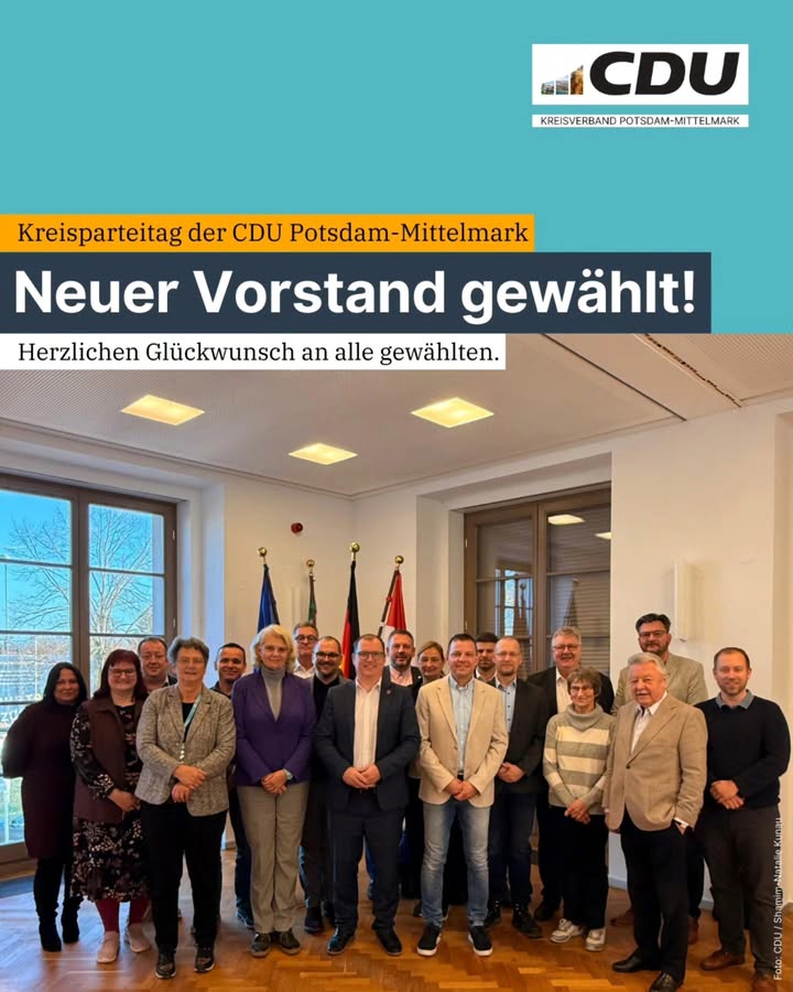 mehrDie CDU Potsdam-Mittelmark hat ihren Kreisvorstand neu gewählt. Rund 60 Mitglieder stimmten digital ab und bestätigten Christian Große mit 93 Prozent als Kreisvorsitzenden.Neu im Leitungsteam: Sabine Haugk, Matthias Schmieder und Richard Kiekebusch als stellvertretende Vorsitzende. Mit dabei im neuen Vorstand auch Dr. Saskia Ludwig und Ehrenvorsitzender Dr. Wolfgang Hackel.Christian Große machte klar, worum es jetzt geht: Verantwortung übernehmen, den Haushalt solide aufstellen und Potsdam-Mittelmark stabil durch die nächsten Jahre führen.#cdupotsdammittelmark