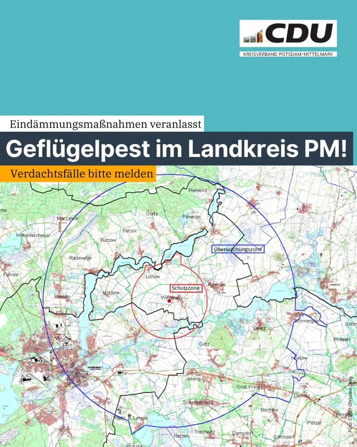 Wichtige Information!!!!🐔 Geflügelpest im Landkreis Potsdam-Mittelmark bestätigtIn einem Putenmastbetrieb im Amt Beetzsee wurde die Geflügelpest nachgewiesen. Der Landkreis hat zur Eindämmung eine Tierseuchenallgemeinverfügung erlassen.📍 Rund um den Betrieb gelten eine Schutzzone (3 km) und eine Überwachungszone (10 km).➡️ Geflügel muss so gehalten werden, dass kein Kontakt zu Wildvögeln möglich ist.🚫 Geflügelausstellungen und -märkte sind in den Zonen vorübergehend untersagt.🔎 Verdachtsfälle bitte melden an:Veterinäramt Potsdam-Mittelmark📞 033841 533 271📧 vetamt@potsdam-mittelmark.deℹ️ Weitere Infos und die Karte der Zonen:👉 potsdam-mittelmark.de ? Geflügelpest im Amt Beetzsee